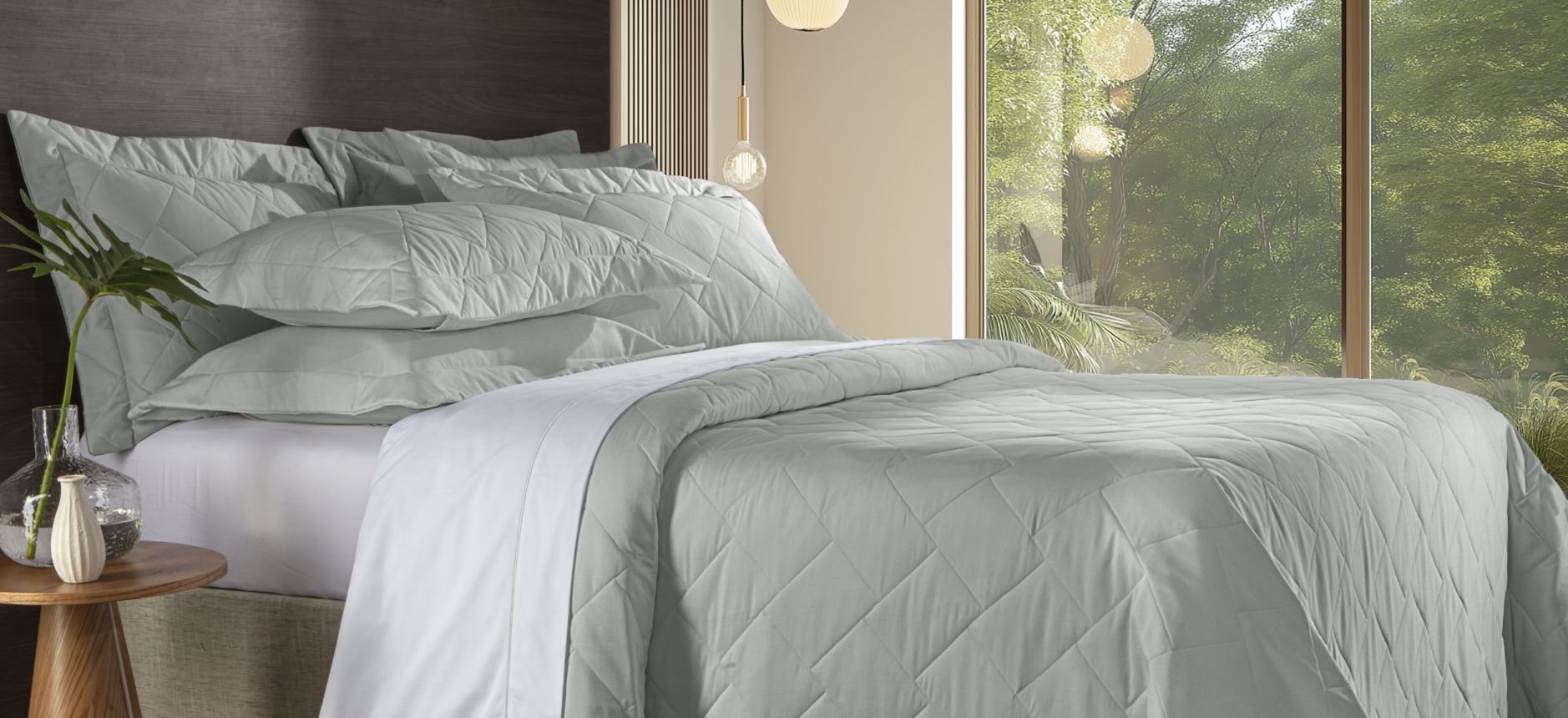 A Colcha Montrelle é produzida em tecido percal 300 fios de algodão egípcio, com toque acetinado. Apresenta acabamento em viés e caimento refinado. O porta-travesseiro possui o mesmo padrão de matelado, confeccionado com 3 abas.